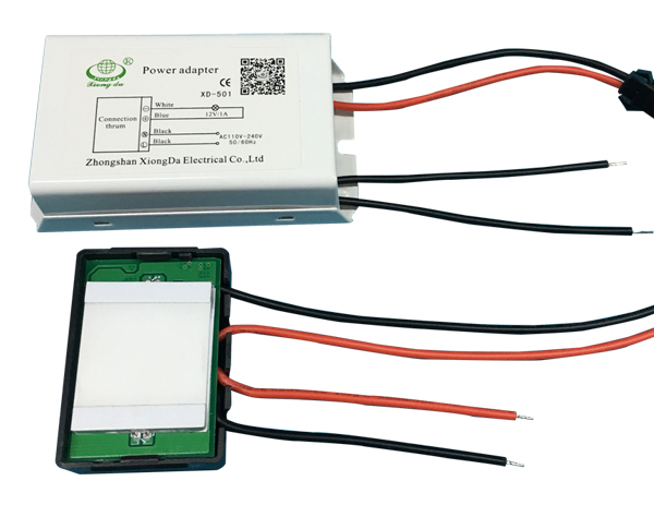 接线方式:电源上的2条黑线接AC100-250V输入,触摸头上的红线为DC12V“+”输出接LED灯具“+极”,黑线为DC12V“-”输出接LED灯具“-极”, 黑色的触摸头安装在镜子的背面。 |